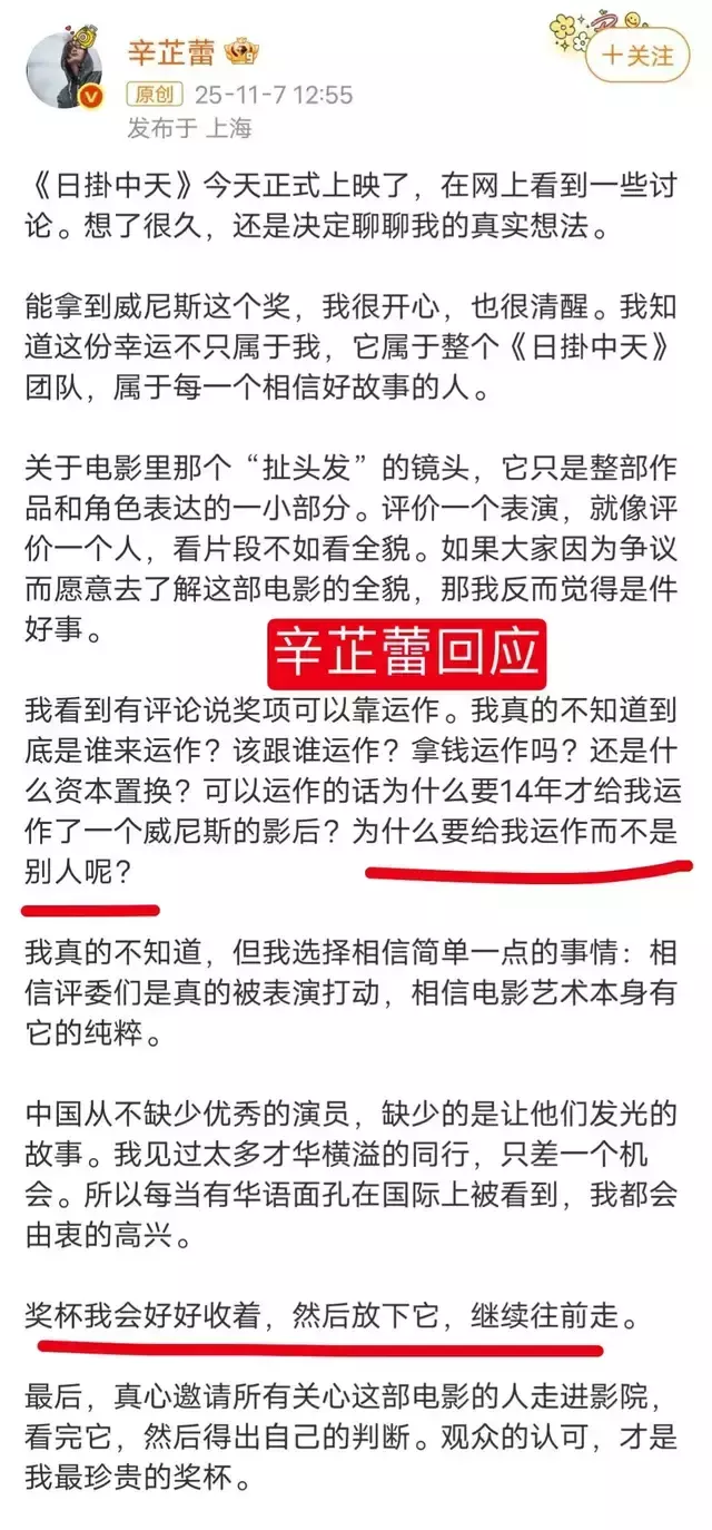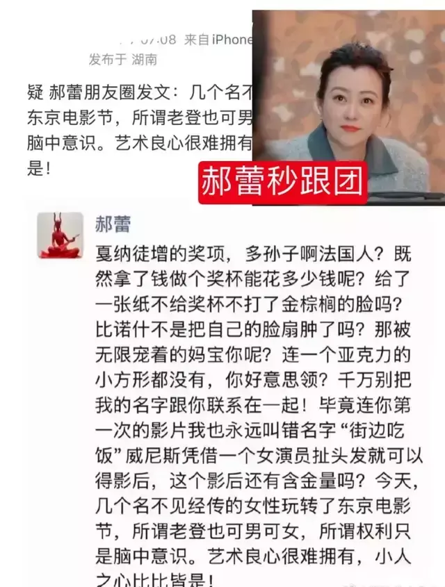 还没完,莫名其妙的,郝蕾在朋友圈发表激烈言论,不仅质疑东京电影节的公正性,还顺带讽刺了威尼斯和戛纳电影节,不点名地批评了其他获奖演员。这番言论,无疑给本已复杂的局势火上浇油。矛头对准谁用说了吧。这不,刚刚获得威尼斯影后的辛芷蕾也不得不站出来回应,委婉地表达了对奖项公正性的信任。一场本该属于中国电影人的荣耀时刻,就这样被一场始料未及的争议搅得乌烟瘴气。