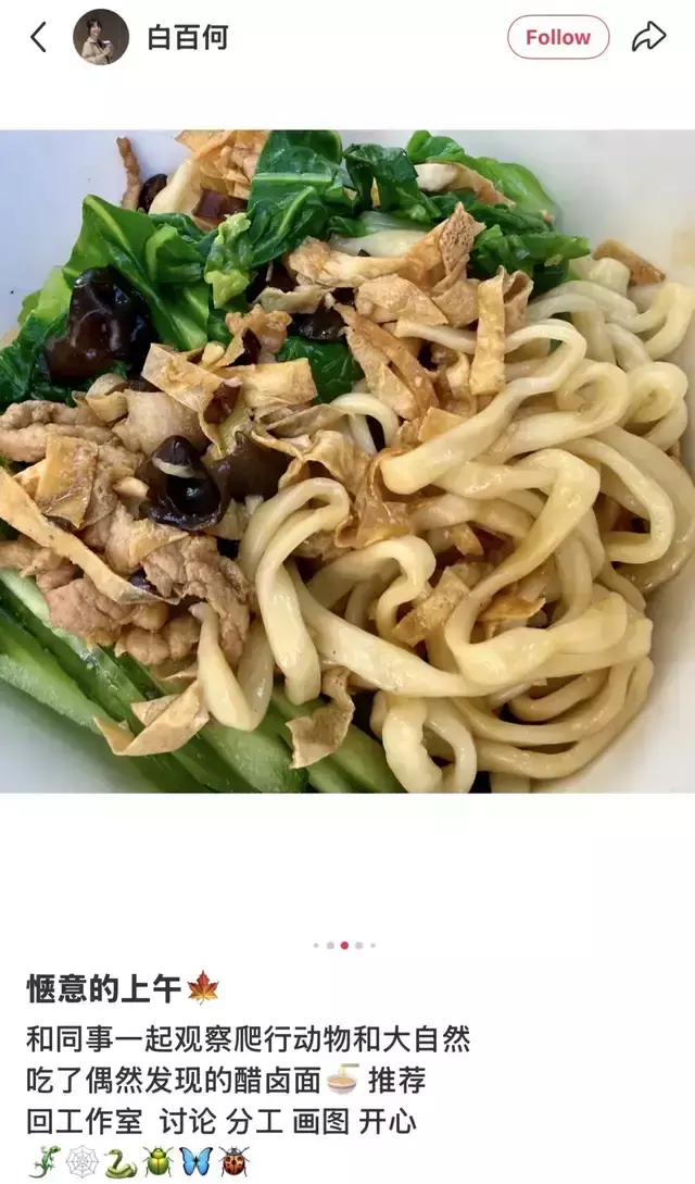 风波后,白百何被媒体拍到一脸笑容地接送儿子放学,并于在某书上悠闲地分享与同事欣赏北京的秋天,观察爬行动物、吃醋卤面的惬意日常。事业遇风波,生活照常过形成了强烈反差。
